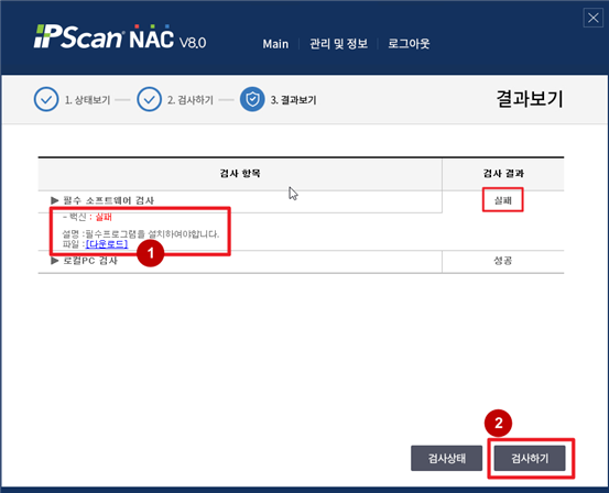 기타 메인으로 이동 기타 학교소개 입학안내 대학 대학원 학사안내 대학생활 동아광장 닫기 기타 기타 네트워크 차단 SNS 목록열기 FACEBOOK 공유하기 TWITTER 공유하기 BLOG 공유하기 KAKAO STORY 공유하기 SNS 목록닫기 인쇄 url 복사 NAC 에이전트 설치 단말 – 네트워크 차단 1 사용 중 오른쪽 아래의 메시지는 클릭하여 확인 필요 2 - 교내 필수프로그램 미설치 단말기는 링크를 클릭하여 설치 - 불법 소프트웨어가 설치된 단말기는 프로그램 삭제 - 설치 및 삭제 완료 이후 검사하기 버튼을 눌러 검사 결과 ‘성공’ 확인